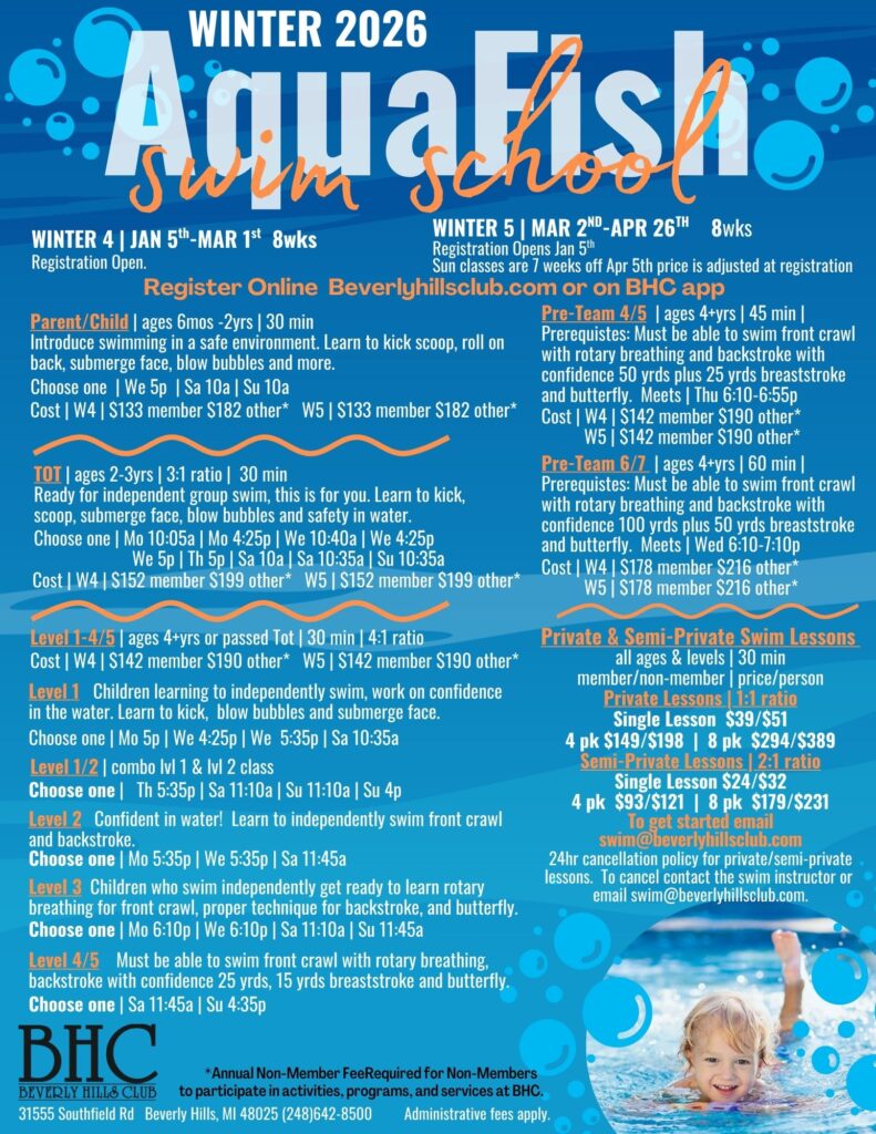AquaFish Swim School at BHC, teaches the American Red Cross Learn-to-Swim program. AquaFish features a curriculum to ensure each child properly progresses through the skills and levels. Children learn swimming skills and safety in and around water.